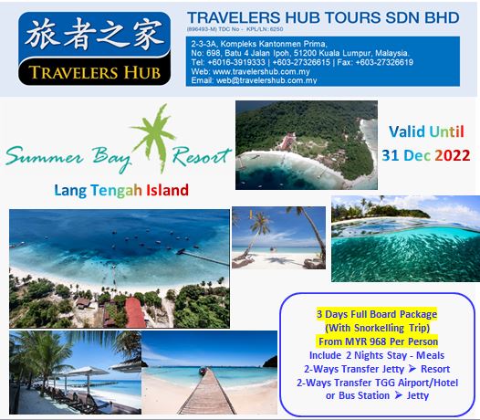 Enjoy a hassle-free island vacation with this comprehensive Holiday Package. 2022 Promo 3d2n Lang Tengah Summer Bay Resort Snorkeling Package. Book your next trip to Lang Tengah Island with Tripfez.